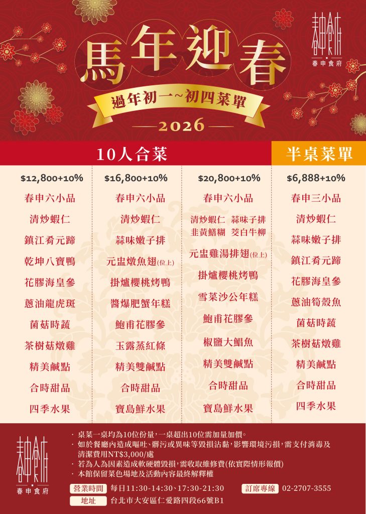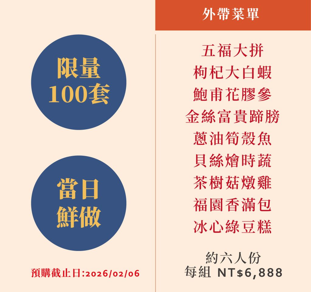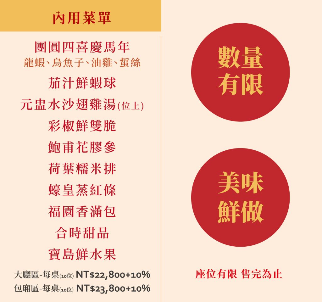 年菜外帶訂購單點此下載.優惠內容不得換菜,若有換菜需求皆須加價即可保留超值專案內容。.桌菜一桌均為10位份量,一桌超出10位需加量加價,才可享有超值專案內容。.如有硬體設備需求需額外計費,若有KTV設備廠商需求,須提前告知代服務.如於餐廳內造成嘔吐、髒污或異味等毀損及環境污損,需支付清潔費用$3,000起/處。.若為人為因素造成軟硬體毀損,需收取維修費(依實際情形報價).本館保留菜色場地及活動內容最終解釋權。